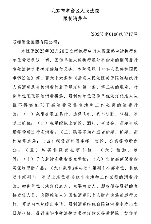 限消令显示,北京市丰台区人民法院于2025年3月20日立案执行申请人侯亚璐申请执行石榴置业劳动争议一案,因公司未按执行通知书指定的期间履行生效法律文书确定的给付义务,依照相关规定,对公司采取限制消费措施。